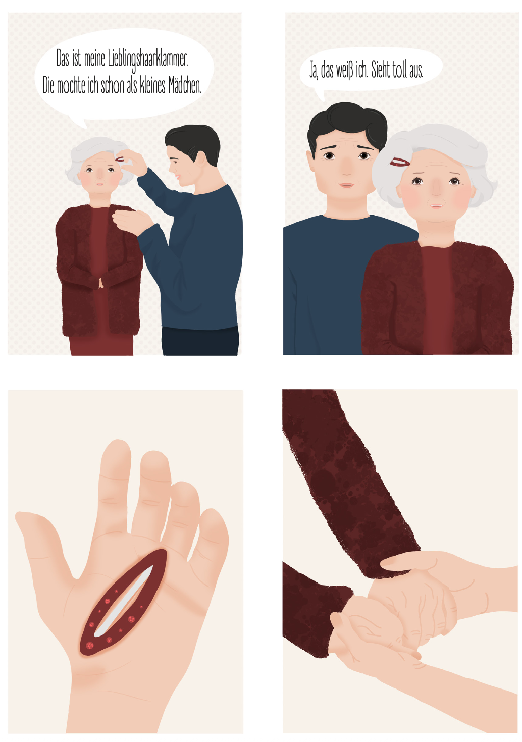 In einfühlsamen Szenen wird sichtbar, wie sich Beziehungen verändern und wie sich Rollen verschieben. Im Mittelpunkt stehen das Begleiten im Alltag, Geduld und innere Stärke. Fürsorge vor allem dort, wo Erinnerungen langsam verblassen. Das Vergessen kann nicht aufgehalten werden, aber man kann betroffenen Personen beistehen und sie Schritt für Schritt begleiten. Das Comic dient als einfühlsame Auseinandersetzung mit Demenz aus Sicht der Angehörigen.